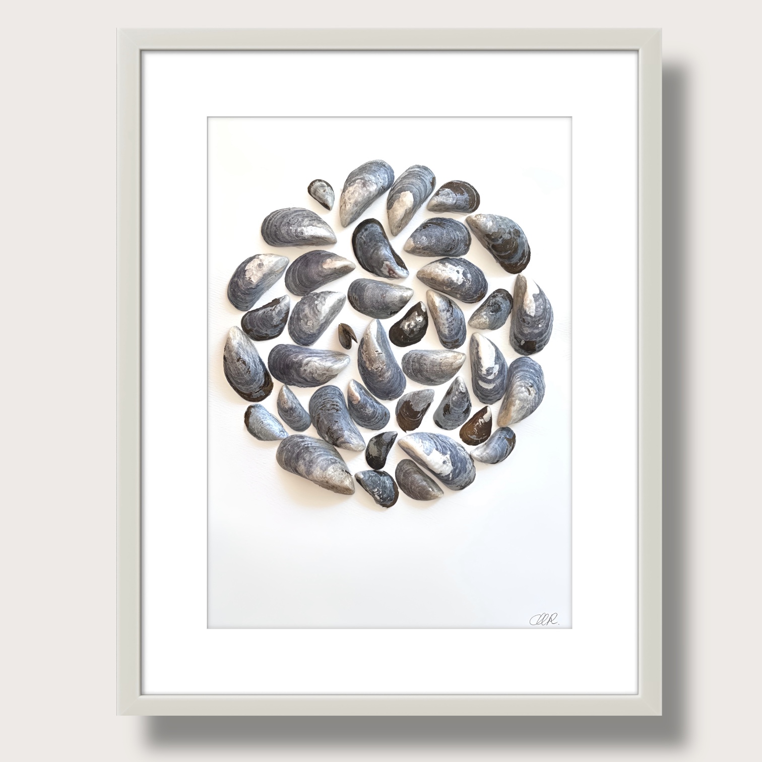 Särö blåmusslor i cirkel 43 x 53 cm inkl vit ram.