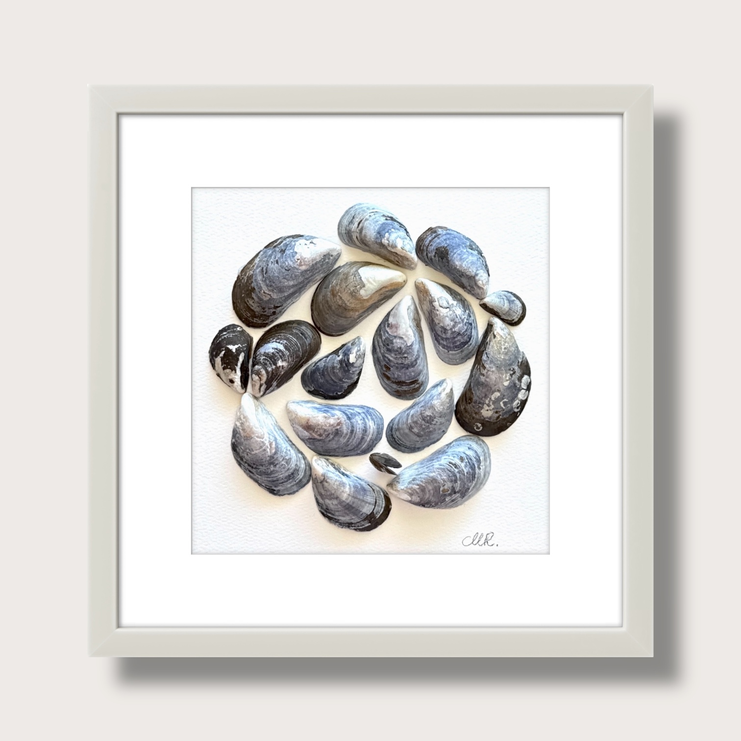 Särö blåmusslor monterade i en fyrkant. 33x33 cm inkl. vit ram
