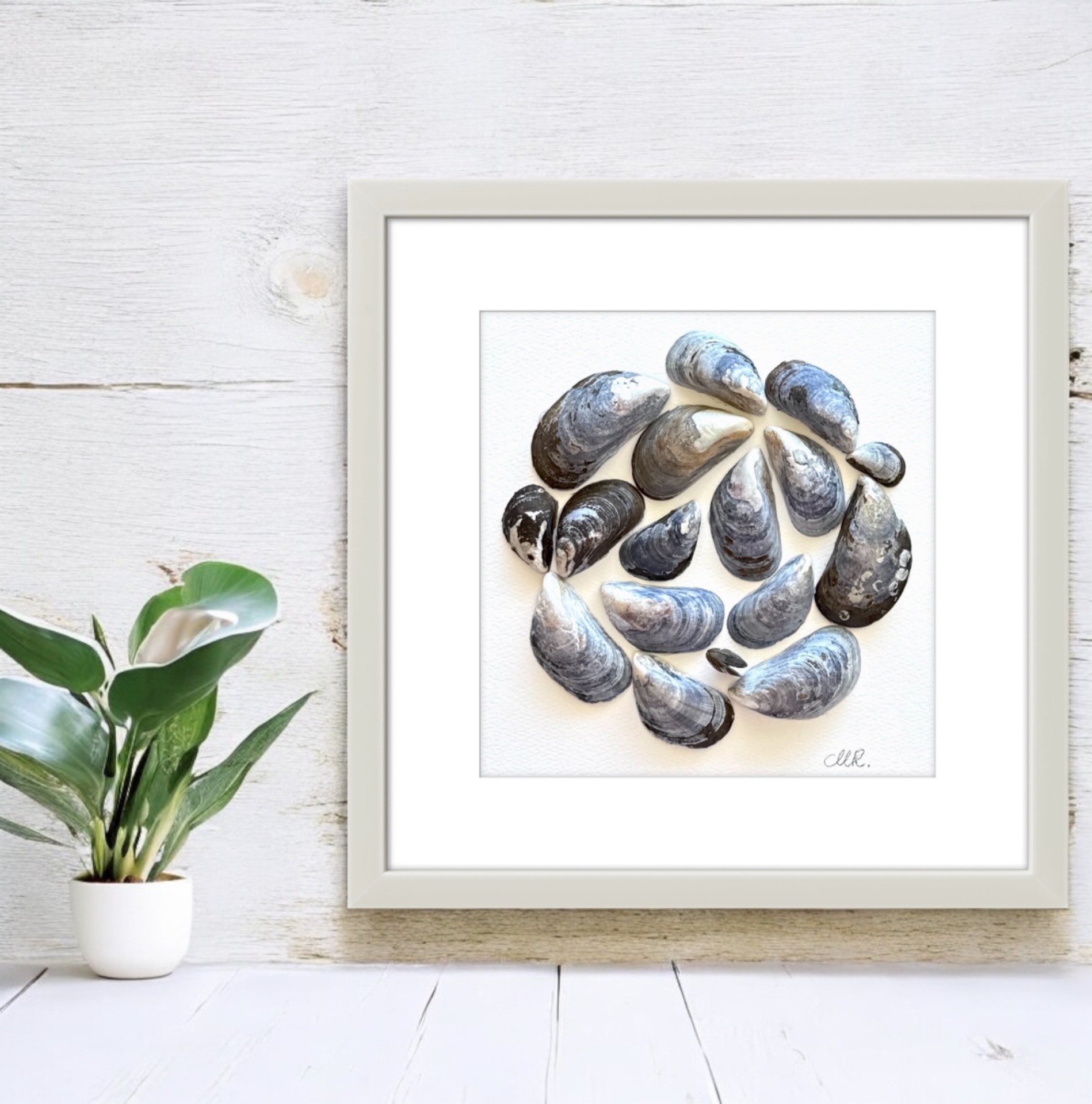 Blue mussels in a circle incl wooden white professional frame. 33x33 cm incl frame.