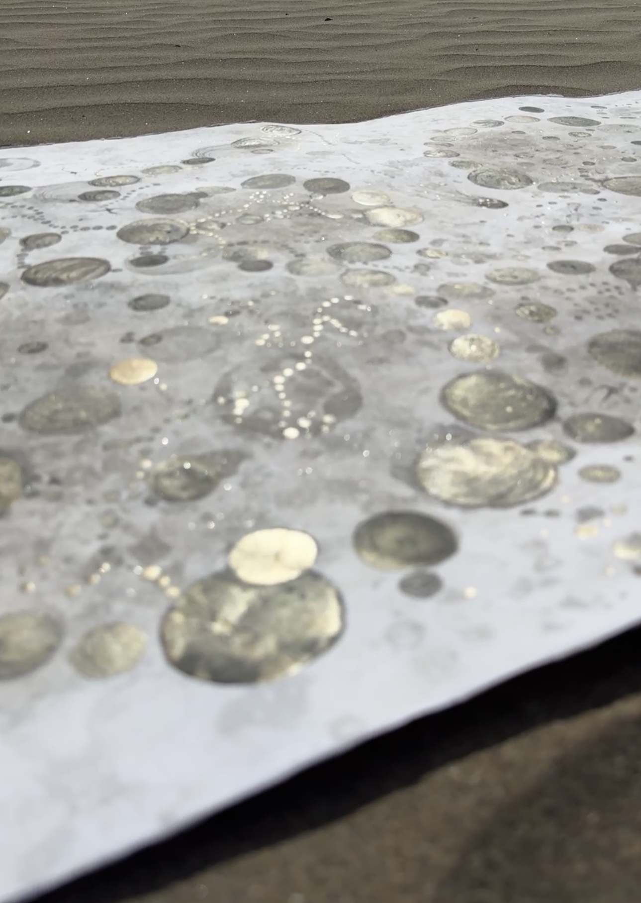 Burras Playa in space. Akvarell och guldfärg. Inspiration Burras Playa på södra Gran Canaria. Ingen ram. 70 x 100 cm.