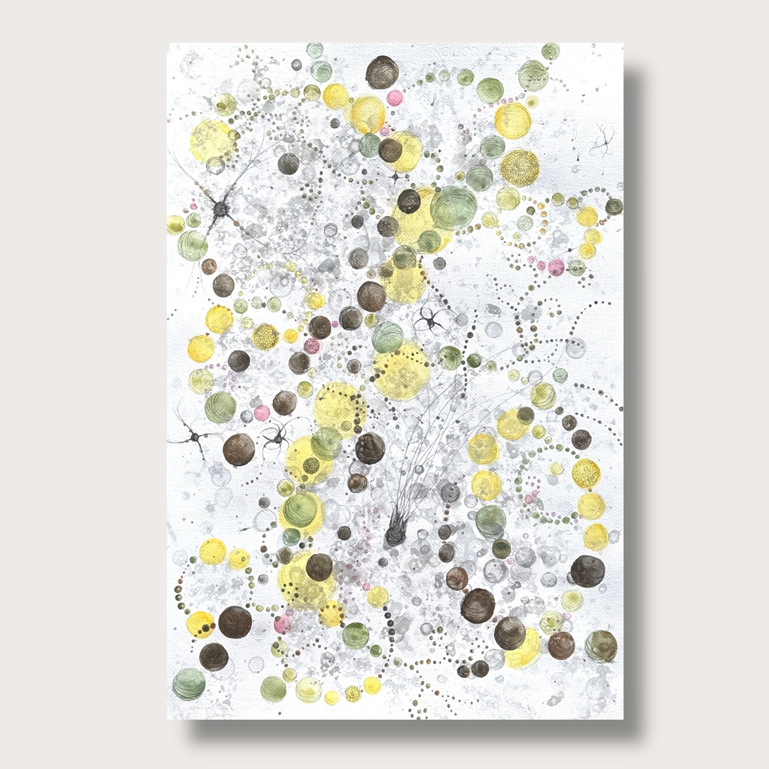 Lemons in space. Citroner i rymden. Akvarell och guldfärg. Det växer mycket citroner på Gran Canaria. Den fantastiska gula citronfärgen är inspiration till denna tavla. Ingen ram. 60 x 70 cm