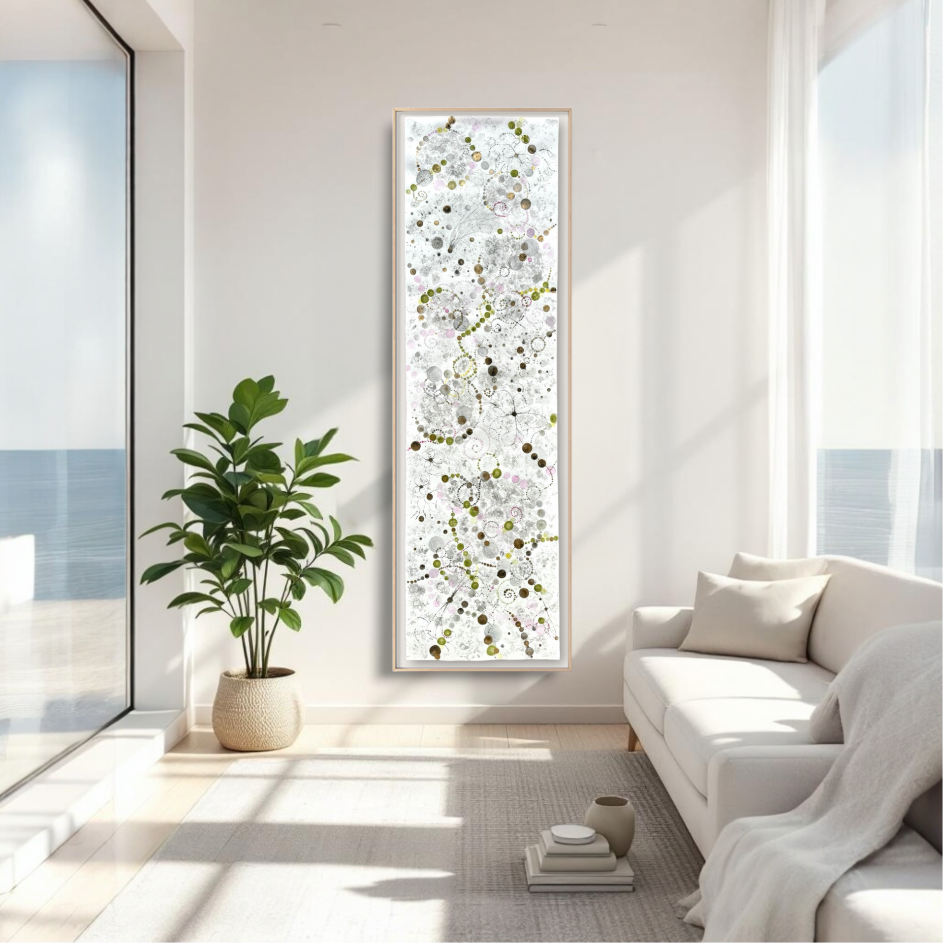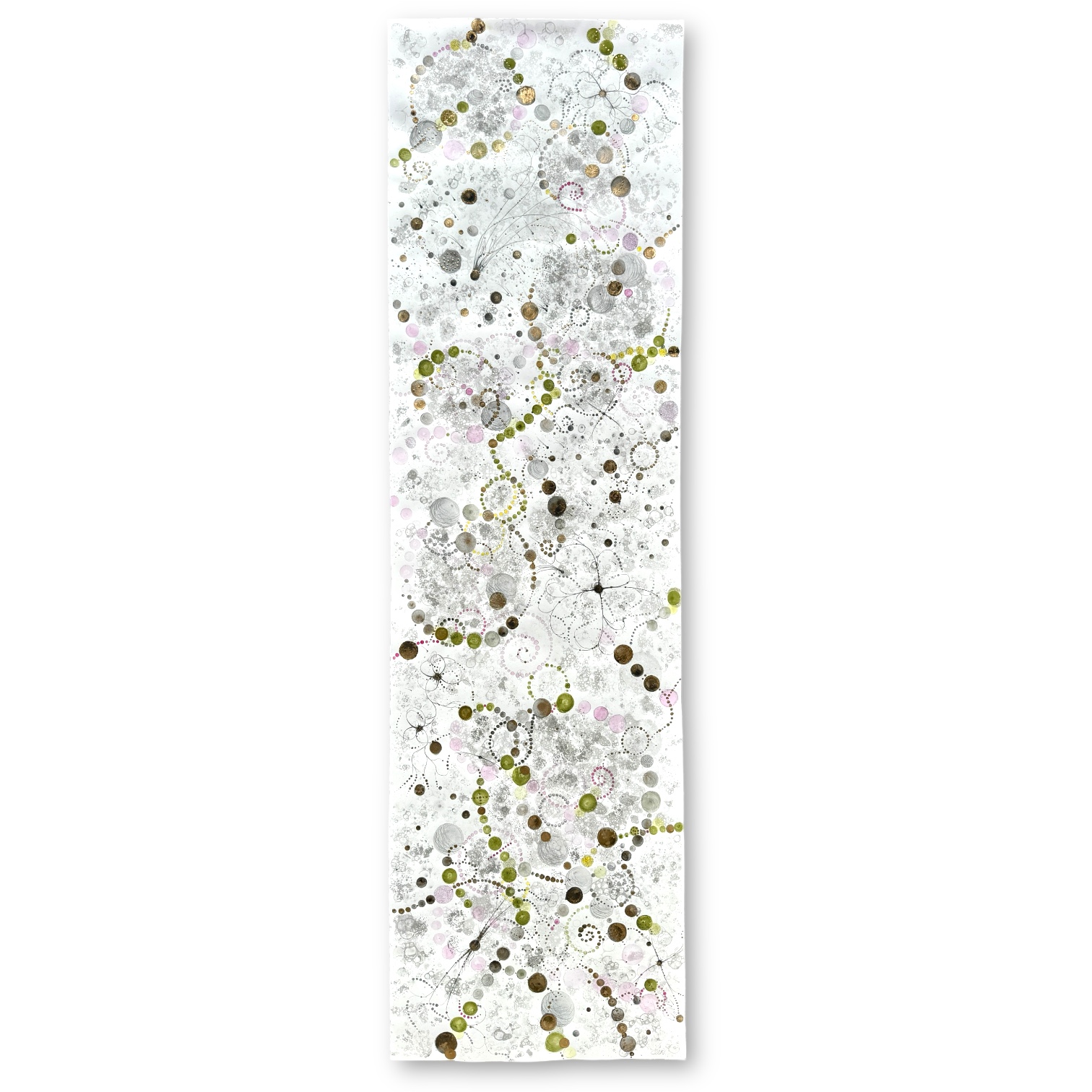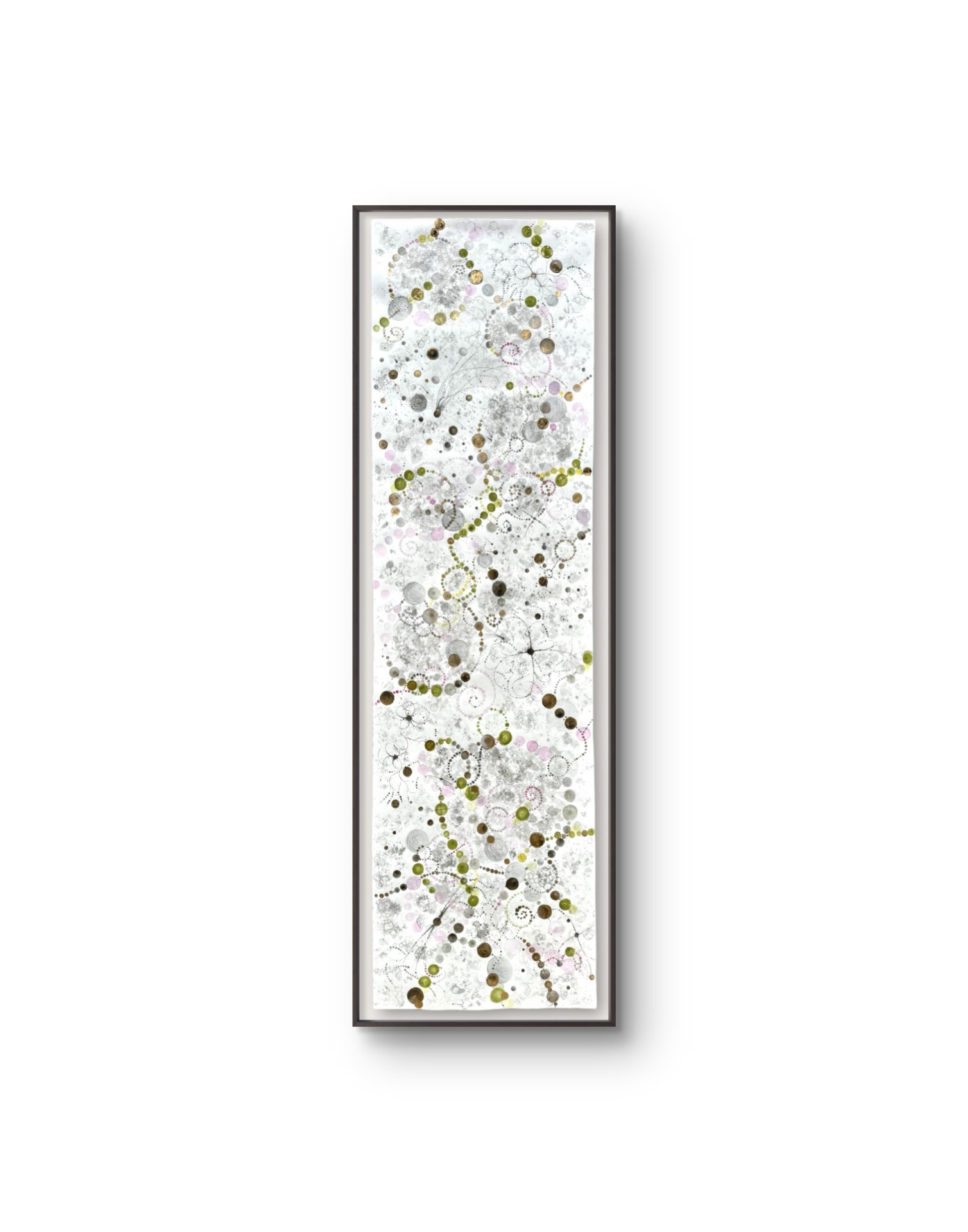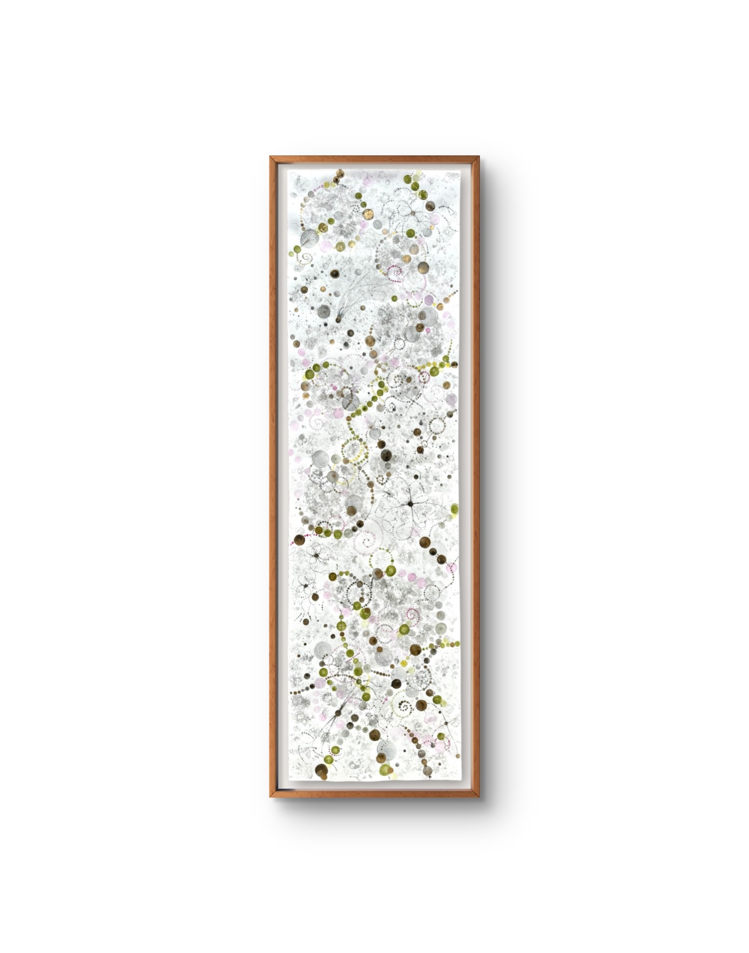 Oramad. Arkets storlek 57 x 200 cm. Akvarell, svart i olika toner, rosa, grön, gul och guld. Tavlan är tänkt att hänga stående. Tavlans färgkomposition kommer från Gran Canarias mandelblomning.