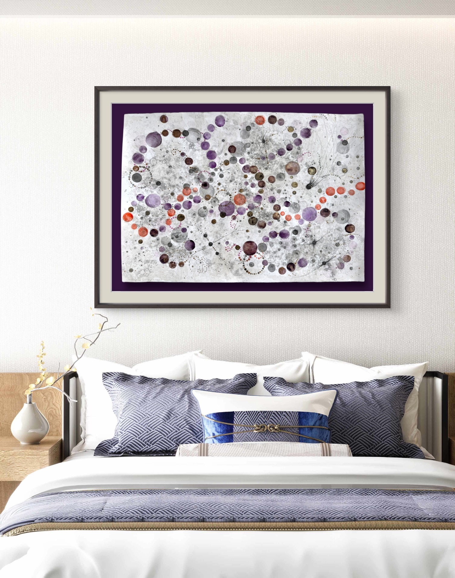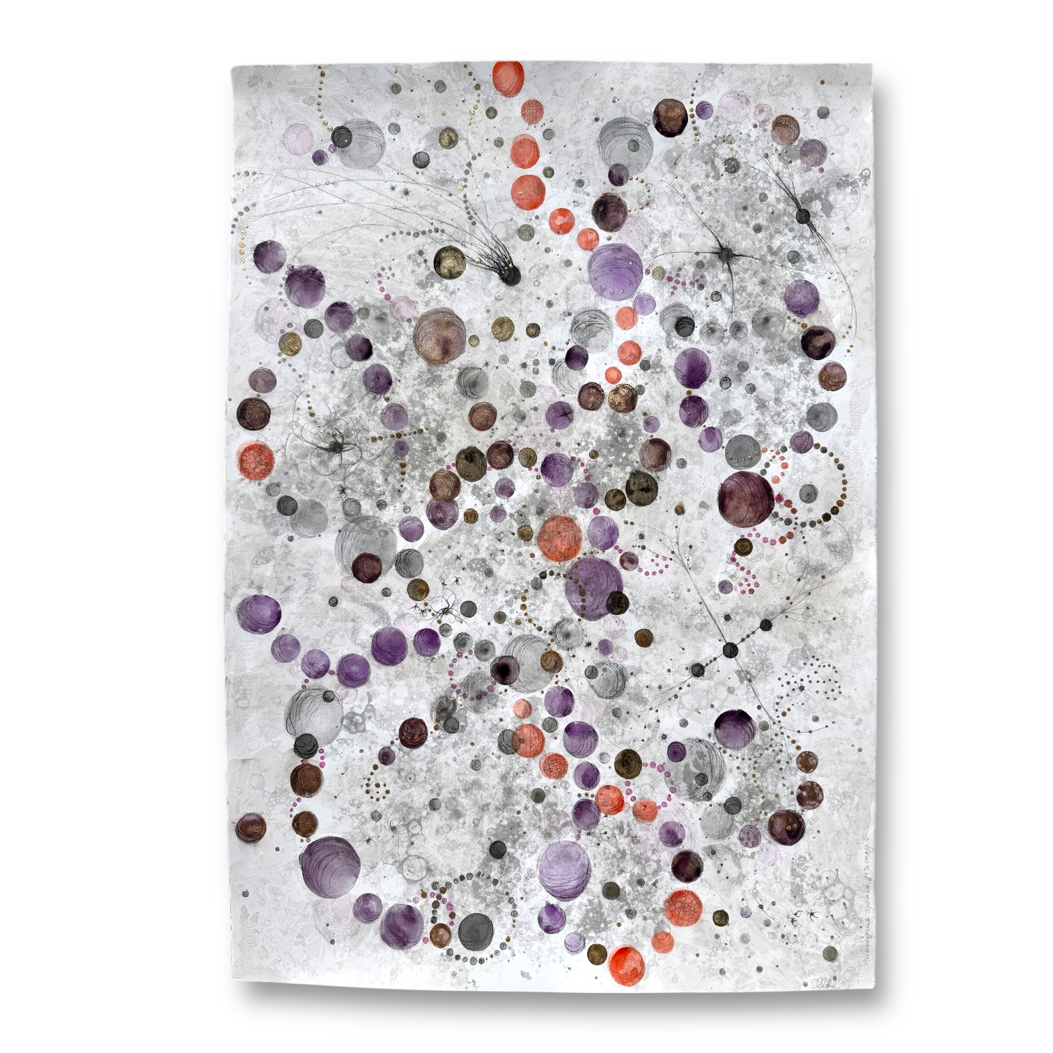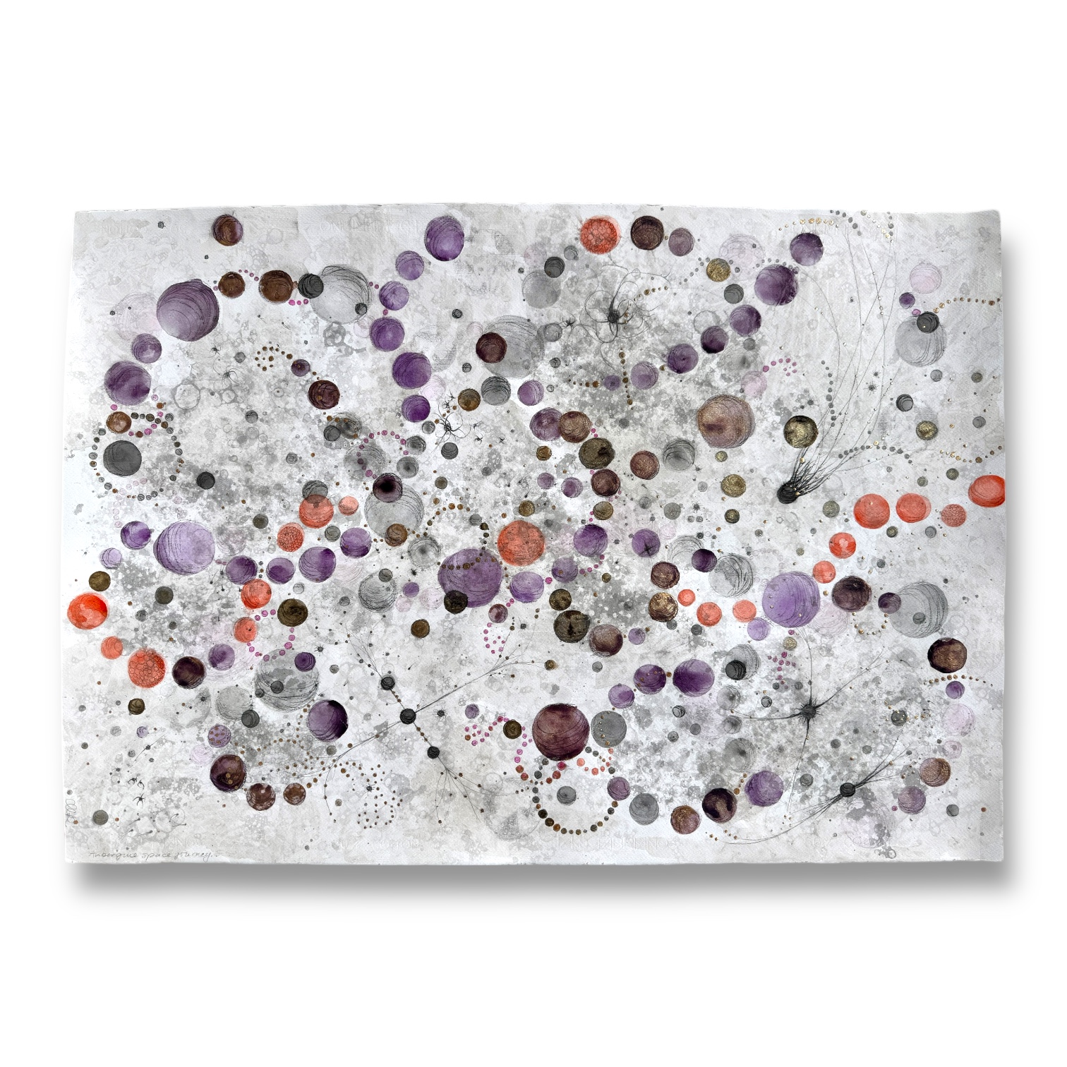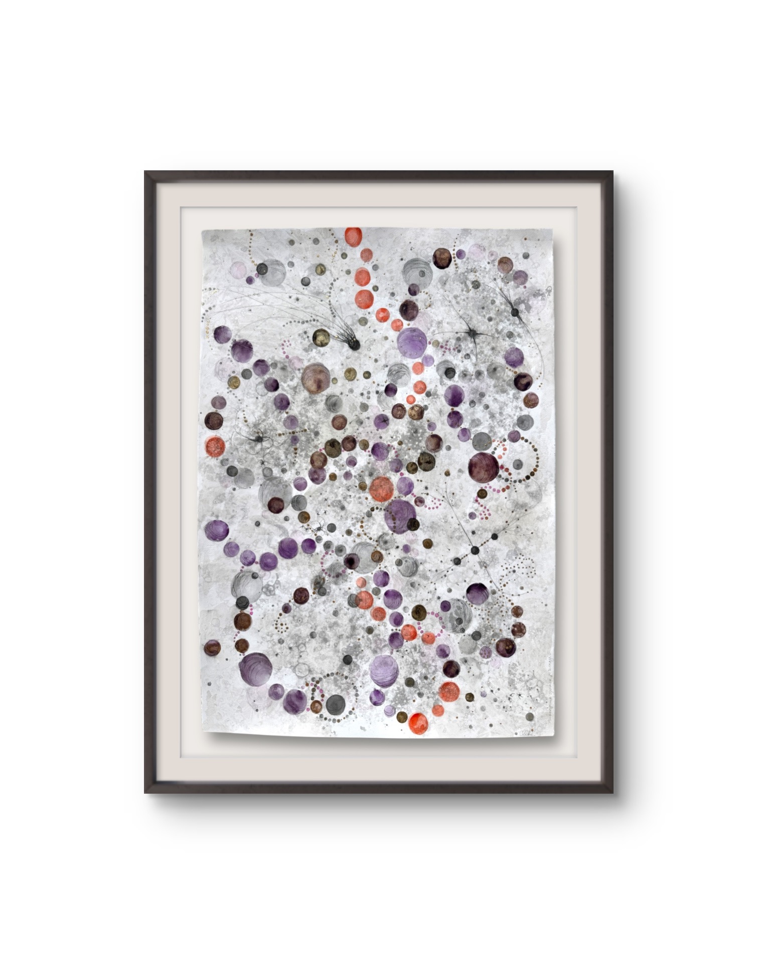 Oramad. Arkets storlek 70 x 100 cm. Akvarell, svart i olika toner, aubergine, orange och guld. Tavlan kan hängas stående och liggande vilket gör att den passar i många miljör.