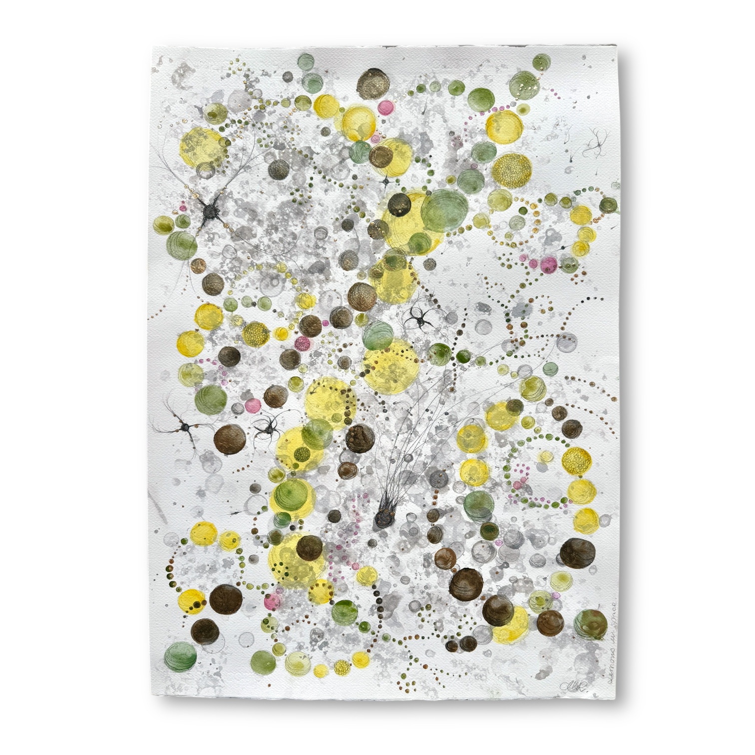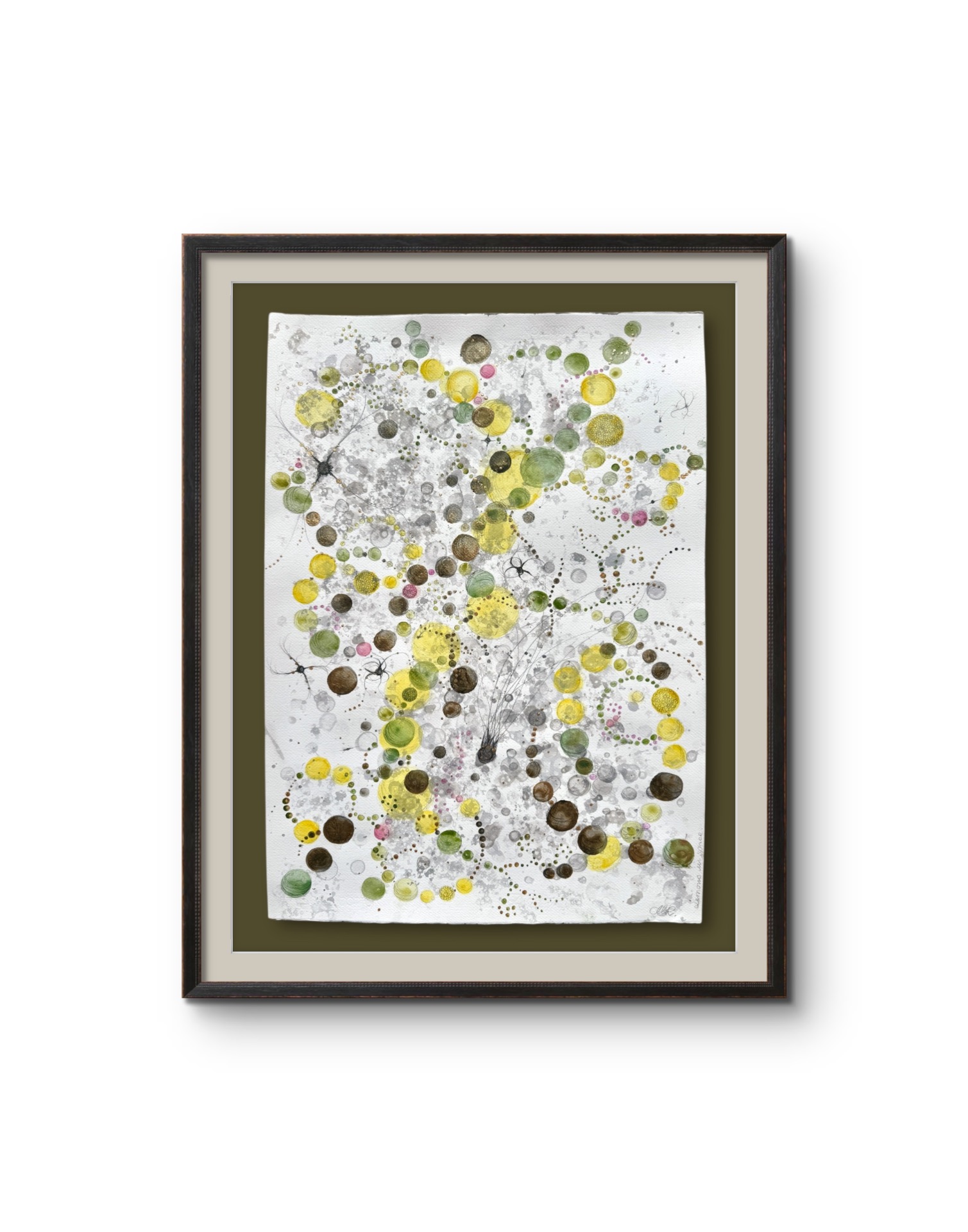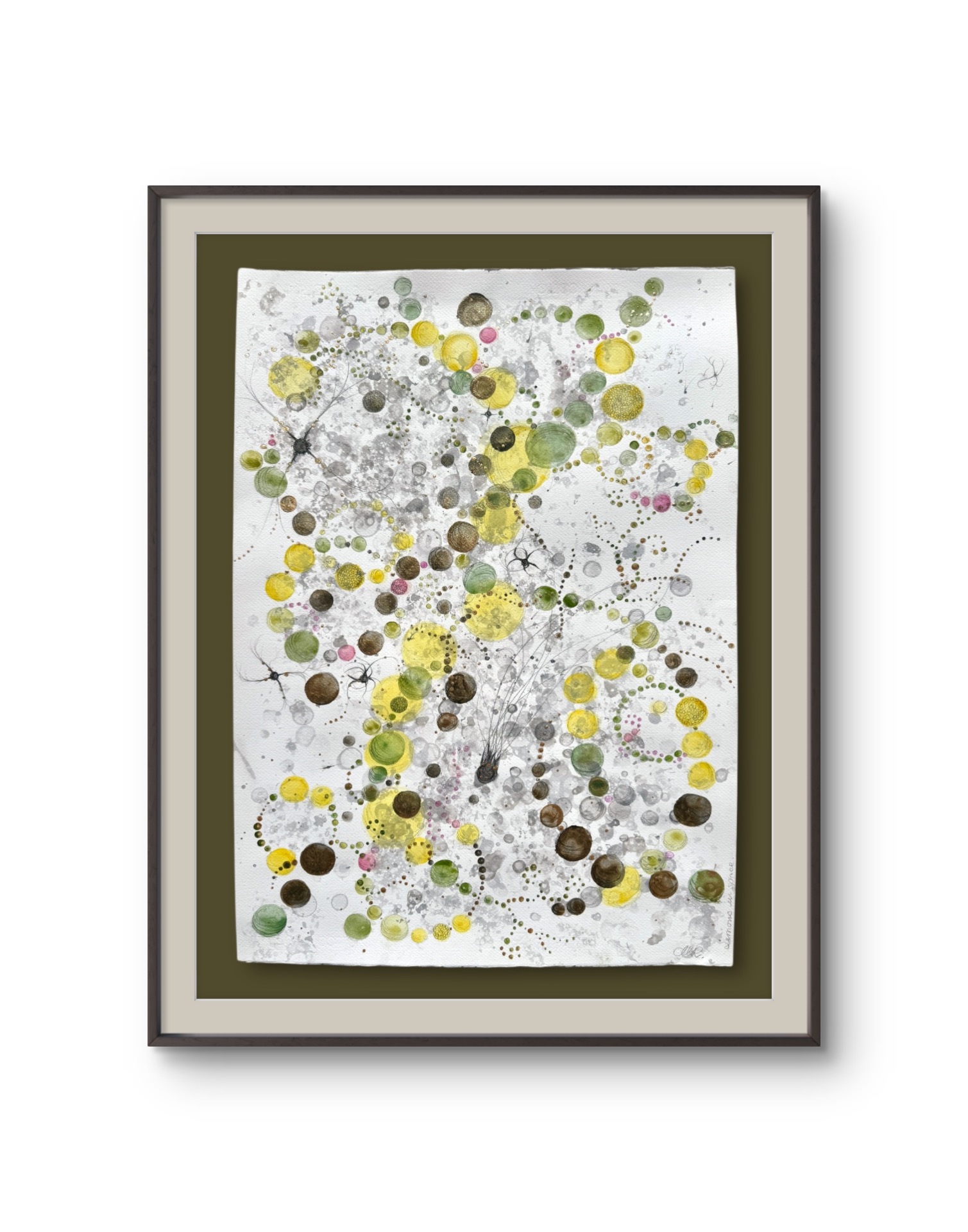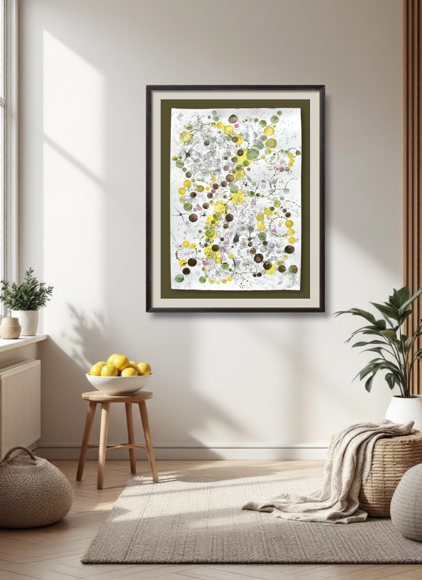 Oramad. Arkets storlek 50 x 70 cm. Akvarell, svart i olika toner, citrongul, grön och guld. Tavlan kom till efter jag hade varit ute och plockat citroner på Gran Canaria. Tavlan kan hängas stående och liggande vilket gör att den passar i många miljör.
