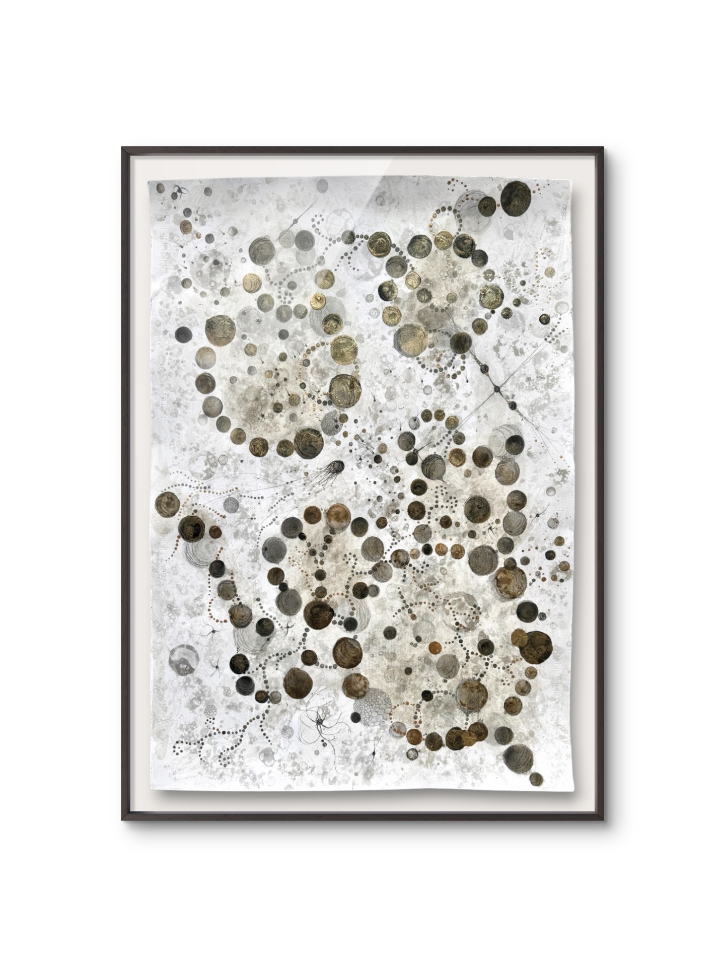 Oramad. Arkets storlek 70x 100 cm. Akvarell, svart i olika toner och guld. Tavlan kan hängas stående och liggande vilket gör att den passar i många miljör.