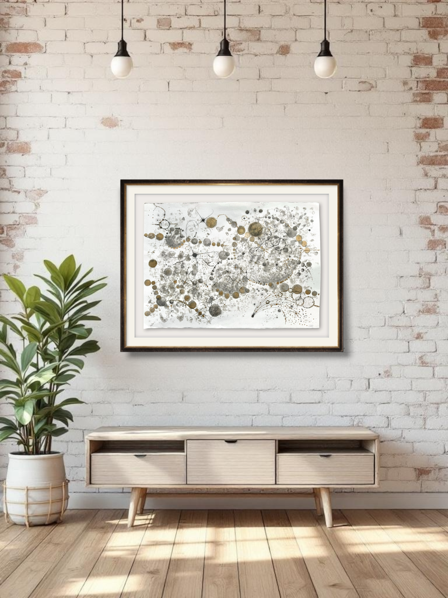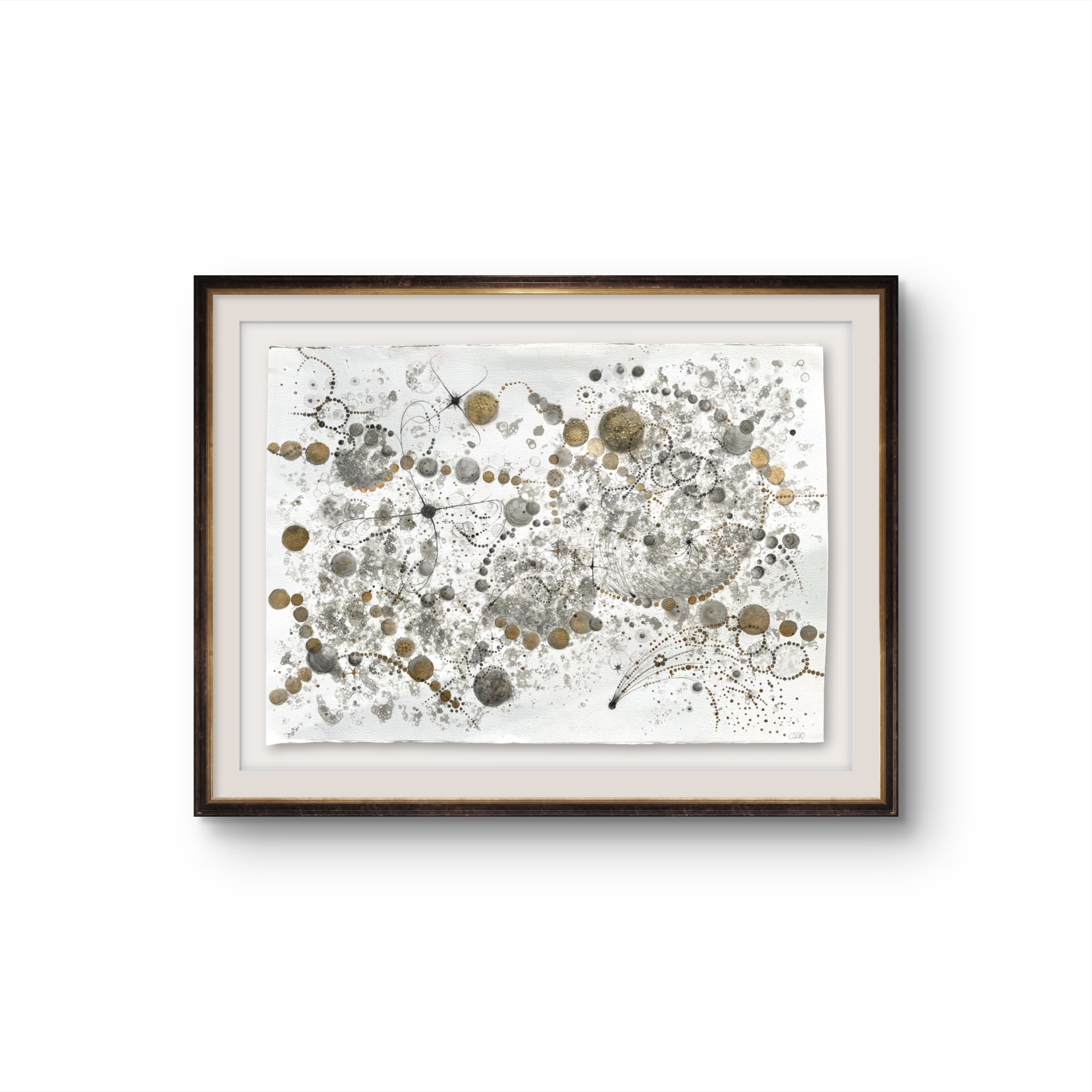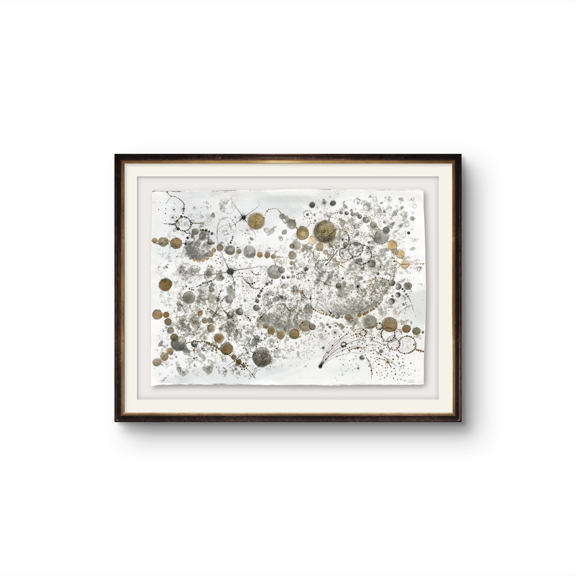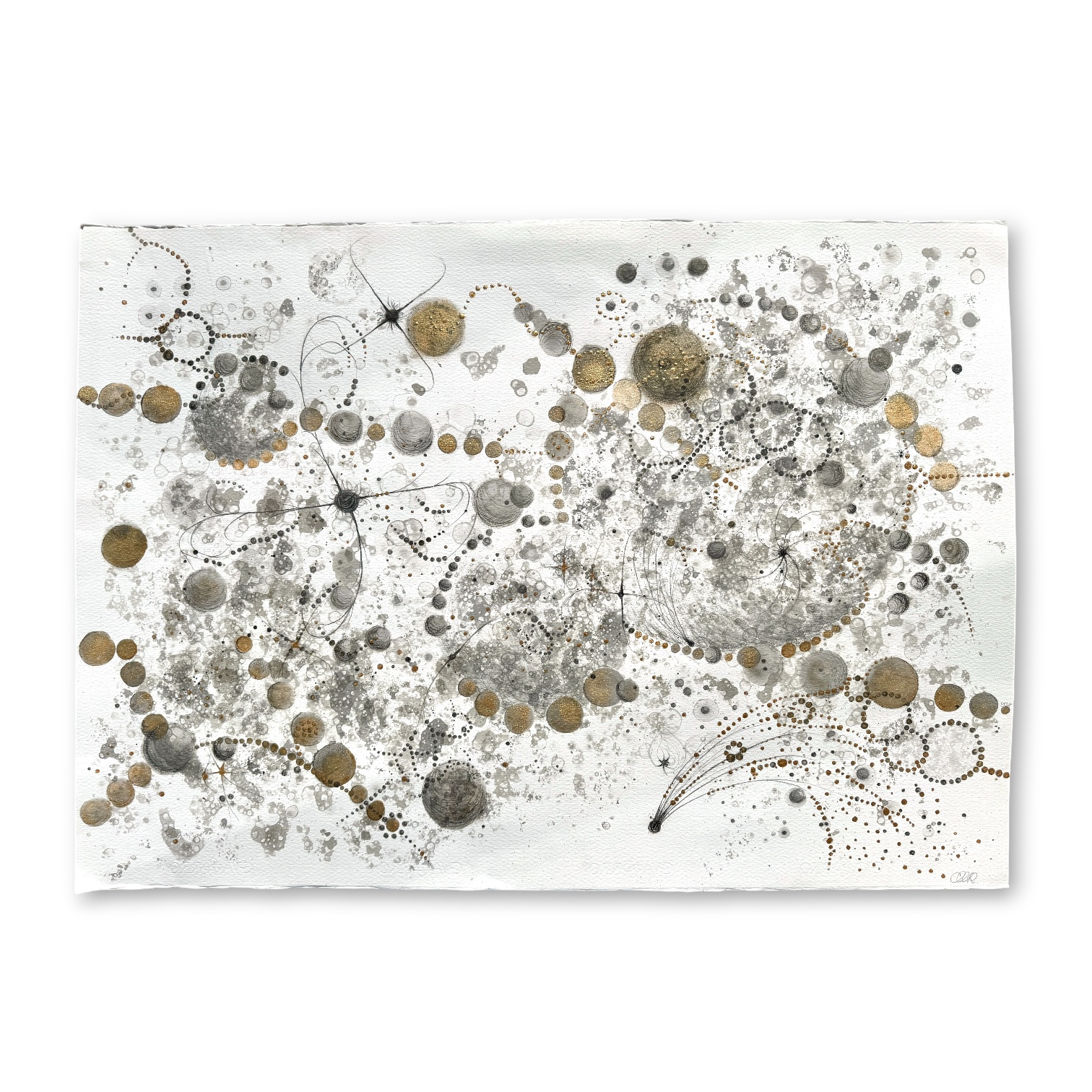 Oramad. Arkets storlek 100 x 70 cm. Akvarell, svart i olika toner och guld. Tavlan kan hängas stående och liggande vilket gör att den passar i många miljör.