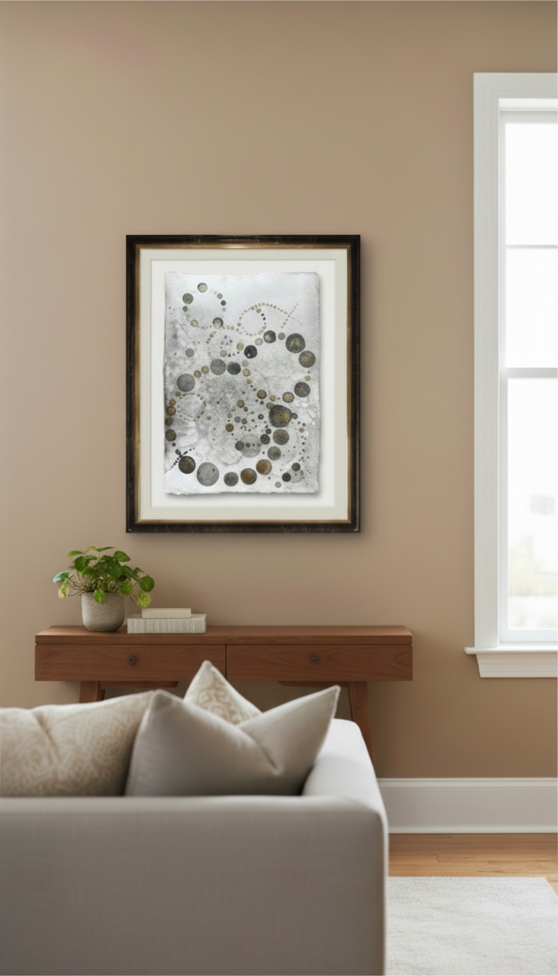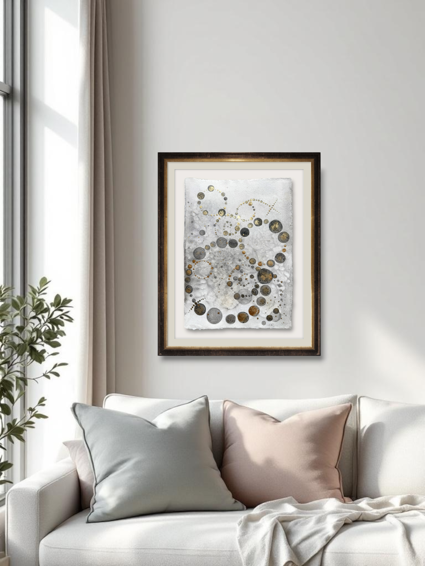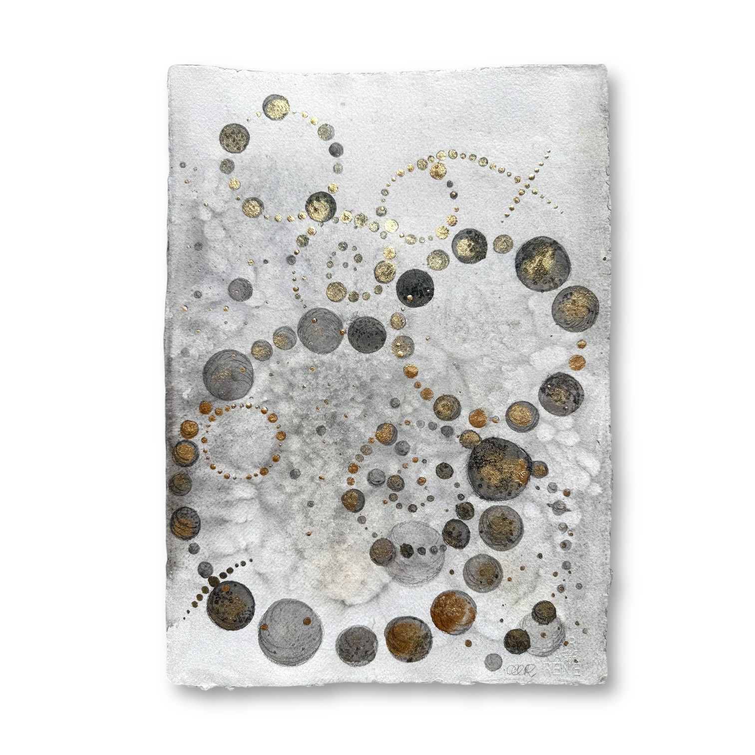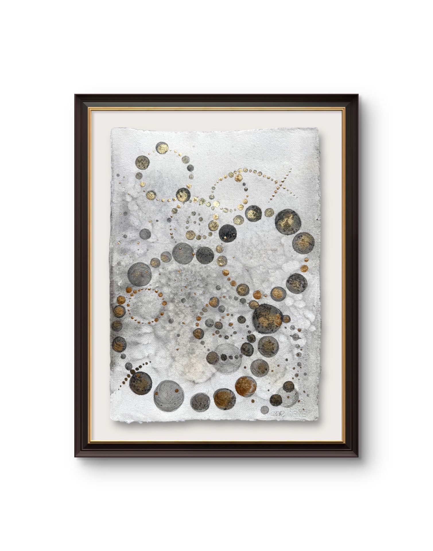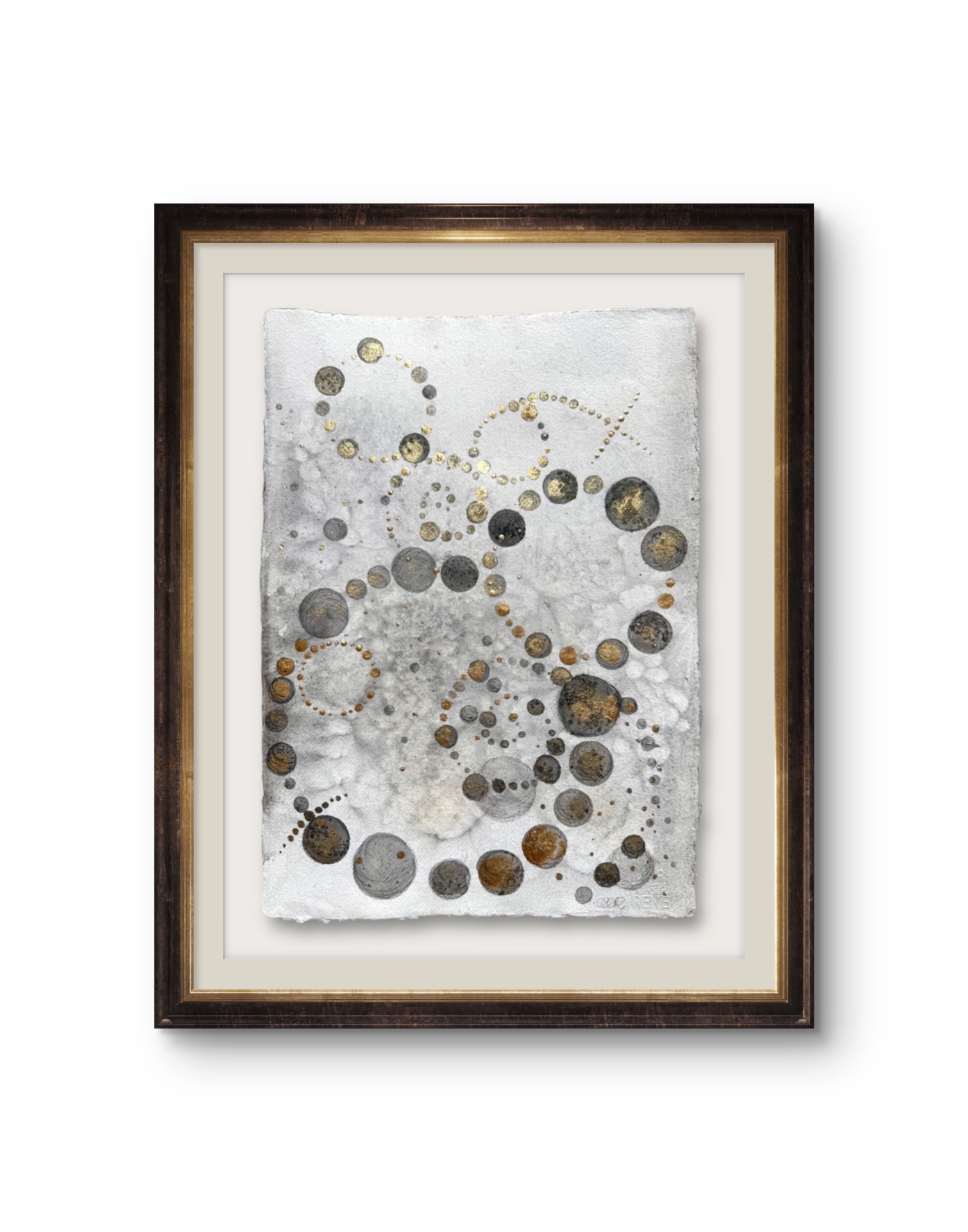Oramad. Arkets storlek 30 x 41 cm. Akvarell, svart i olika toner och guld. Tavlan hängs bäst stående. Indiskt syrafritt papper för en lite råare look.