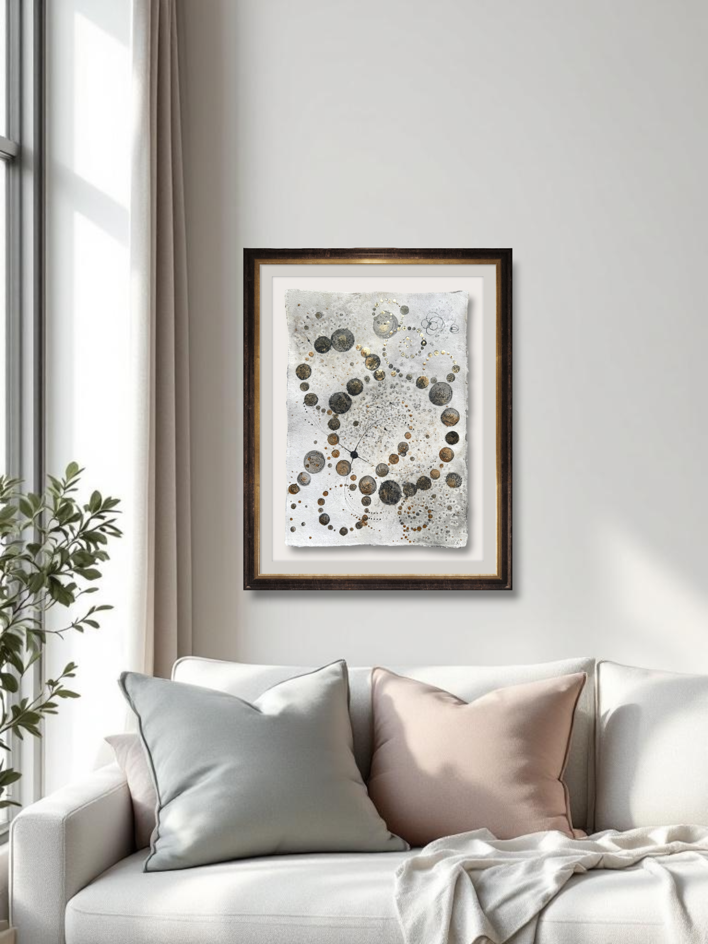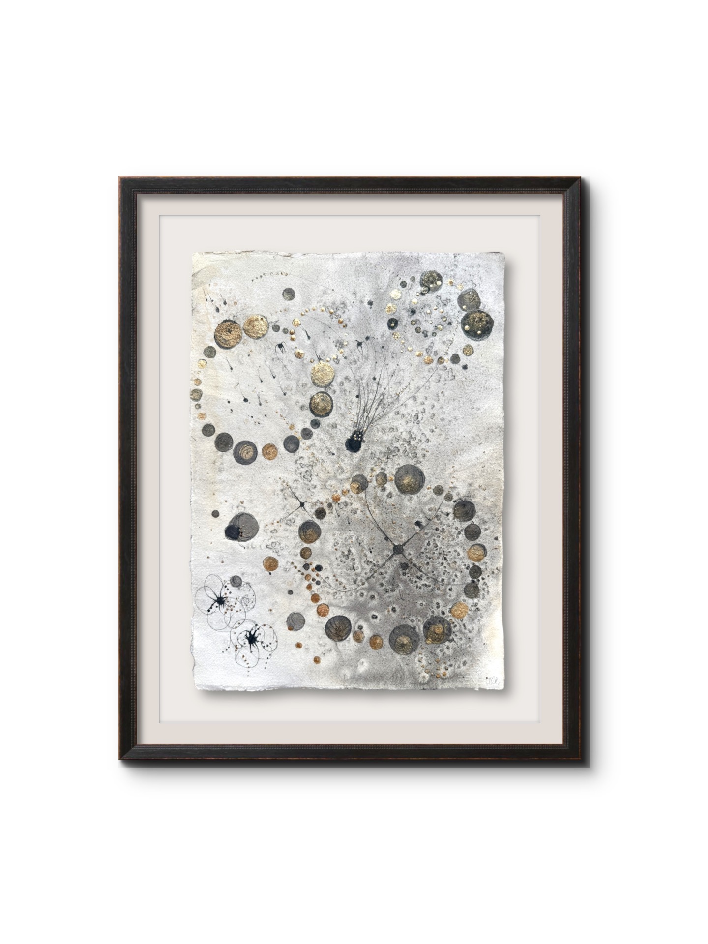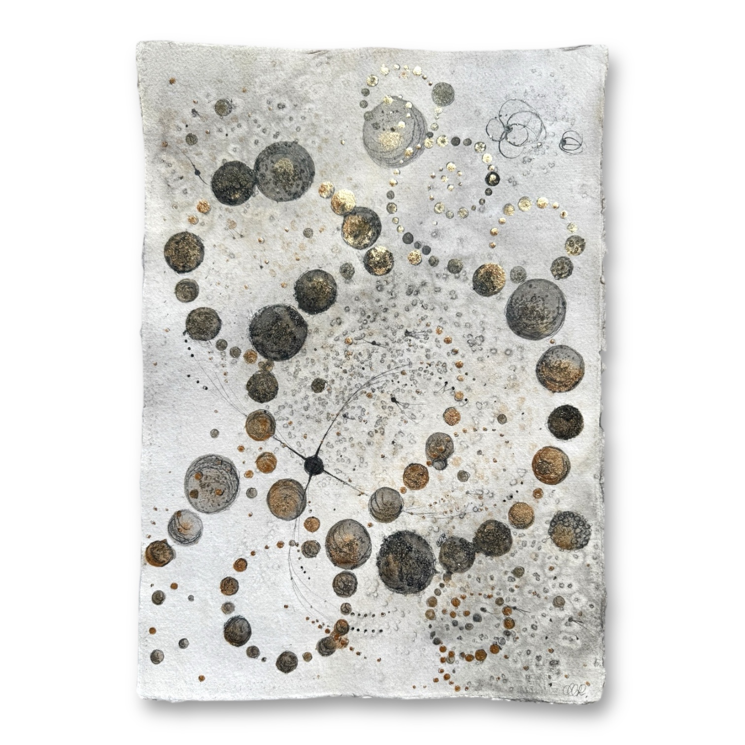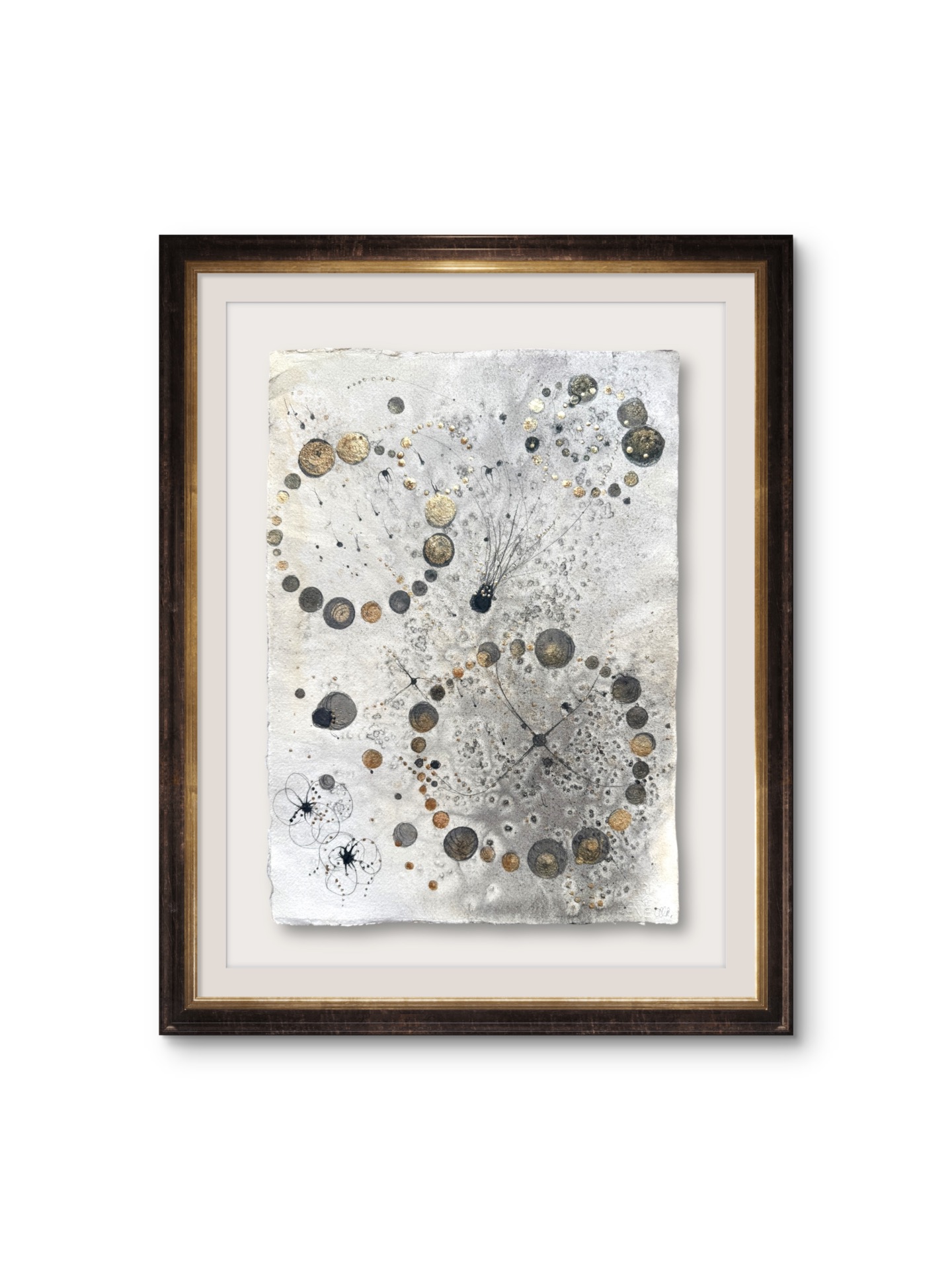 Oramad. Arkets storlek 30 x 41 cm. Akvarell, svart i olika toner och guld. Tavlan hängs bäst stående. Indiskt syrafritt papper för en lite råare look.